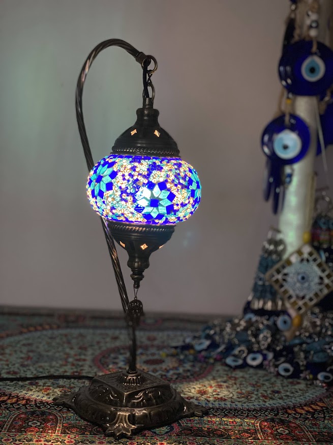 Swan Lamps - Blue Flower is a Turkish mosaic lamp, distinguished by its graceful design and the exquisite beauty of its blue flower motif. Displaying it in your home will bring a subtle elegance to your interior decor, as it captures and reflects the light with alluring precision. Let it be the centerpiece of a room and it will create a timeless atmosphere of luxury and sophistication.